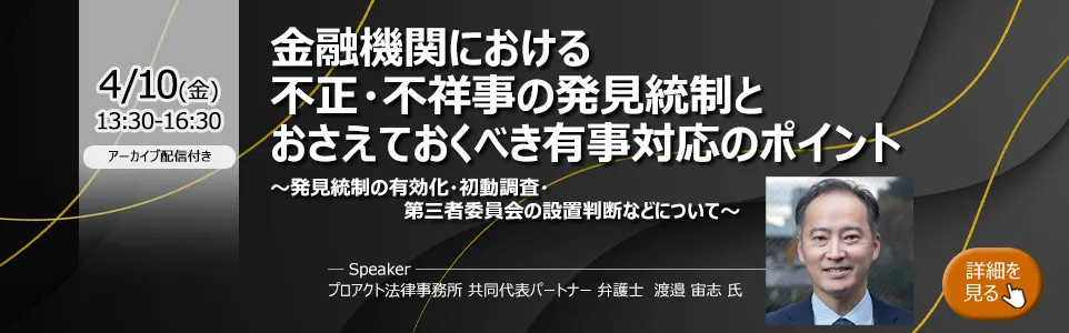 | セミナー名 | 【リバイバル配信】金融機関におけるリスクマネジメント総点検 ~金融激変下の実践ポイント~ |