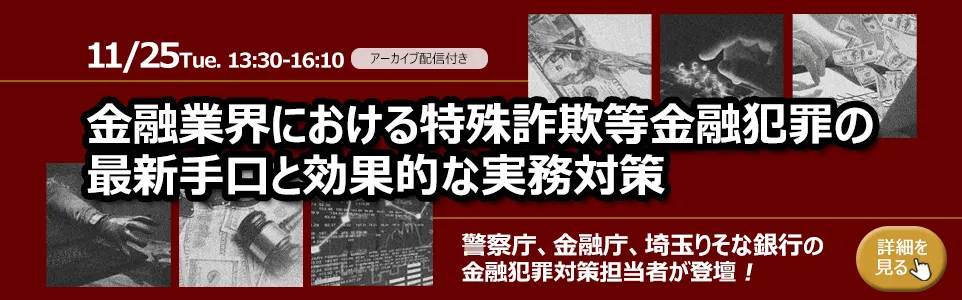 | セミナー名 | 【リバイバル配信】地域金融機関の不祥事対応と重大事務事故の最新動向 ~実務的観点と事例分析を中心に~ |