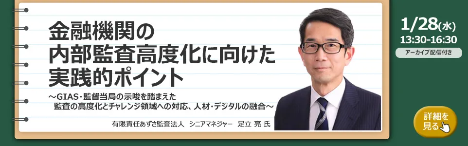 | セミナー名 | 【リバイバル配信】【内部監査高度化コース】「経営に資する監査」(第二、第三、第四段階の監査)の理解とステージアップのポイント ~経営者・監査役・内部監査部門長・シニア管理者を主な対象とします~ |